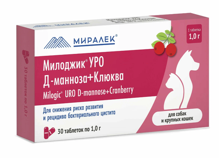 Функциональное лакомство "Милоджик Уро Д-манноза + клюква" - это витаминный комплекс, разработанный специально для собак и больших кошек. Производится в России и содержит в своем составе D-маннозу, экстракт плодов клюквы, экстракт эхинацеи пурпурной, экстракт плодов жимолости, кросповидон, вкусовую добавку, кремния диоксид, магния стеарат и целлюлозу микрокристаллическую. Основная функция этого продукта - предотвращение развития бактериального цистита у животных. В одной таблетке содержится 450 мг D-маннозы, 100 мг экстракта плодов клюквы и 10 мг экстракта эхинацеи пурпурной. "Милоджик Уро Д-манноза + клюква" подходит для всех возрастов и размеров животных, включая пожилых, взрослых и молодых собак и больших кошек. Продукт выпускается в форме таблеток, которые легко дозируются и применяются один раз в сутки из расчета 1 таблетка на каждые 10 кг веса животного. Упаковка содержит 30 таблеток, каждая из которых весит 100 грамм. Важно хранить продукт в оригинальной упаковке производителя, чтобы сохранить его эффективность и свежесть.