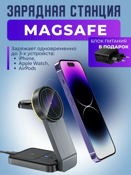 Зарядное устройство 3 в 1 - эта складная беспроводная зарядка для смартфонов, часов и наушников, а также встроенная подсветка - ночник с регулировкой яркости. Используйте ее дома или в офисе. Больше нет необходимости в большом количестве проводов для зарядки гаджетов. Быстрая беспроводная зарядка для iPhone создана для истинных ценителей комфорта, желающий получить всё и сразу. С таким устройством можно одновременно заряжать iPhone(быстрая зарядка 15W), Apple Watch и AirPods. Мягкая LED подсветка с регулировкой яркости заменит настольную лампу, ночник или торшер в комнате. Важно! Примагнититься к зарядной станции смогут только iPhone 12, 13, 14 и 15 (включая Pro, Pro Max), модели ниже (11, X, Xs, Xr, 8) зарядить получится только при помощи чехла MagSafe или специального магнитного кольца. Нет совместимости для смартфонов на базе Android! Беспроводное зарядное устройство обладает технологией стандарта Qi, что позволяет заряжать iPhone с поддержкой беспроводной зарядки.