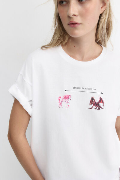 - Женская футболка свободного кроя oversize из дышащей, приятной к телу 100% хлопковой ткани средней плотности - Круглый вырез горловины без воротника. Удлиненные свободные рукава до локтя с прямыми манжетами и спущенной линией плеча. Прямой нижний край без разрезов - Белая хлопковая футболка с принтом из новой зимней коллекции станет идеальным подарком подруге на Новый год, Рождество и другие праздники. Дышащая футболка с принтом-надписью разбавит строгие образы в офис или университет и поможет добавить легкости планеркам и лекциям в восемь утра. Сочетай футболку с расслабленным низом для создания кэжуал-образов. Или надень ее с юбкой-карандаш и завяжи на узел, на миллиметр оголив живот, чтобы создать образ независимой "офисной сирены". Дышащая хлопковая футболка подойдет также для тренировок в спортзале или дома и как удобная домашняя футболка - Размер на модели: S