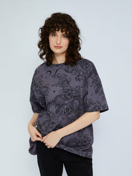 Футболка оверсайз из хлопка с принтом со змеями от Zolla - стильный и комфортный выбор для демисезона и всего года. Оверсайз силуэт обеспечивает свободу движений и позволяет сочетать футболку с различными элементами гардероба. Футболка выполнена из 100% хлопка, что гарантирует мягкость, комфорт и долговечность изделия. Ткань типа "хлопок" приятна на ощупь и обладает хорошей воздухопроницаемостью. Темно-серый цвет футболки подойдет к любому образу и станет отличным дополнением к вашему гардеробу. Принт со змеями придает футболке оригинальность и делает ее ярким акцентом в вашем образе. Воротник типа "r-neck" добавляет изюминку и делает футболку еще более стильной. Футболка подойдет для любого сезона, благодаря своей всесезонности. Параметры размера L: обхват бедер 102-106 см, обхват груди 94-98 см, обхват талии 76-80 см. Выбирая футболку оверсайз из хлопка с принтом со змеями от Zolla, вы получаете стильное, комфортное и качественное изделие, которое станет вашим любимым элементом гардероба.