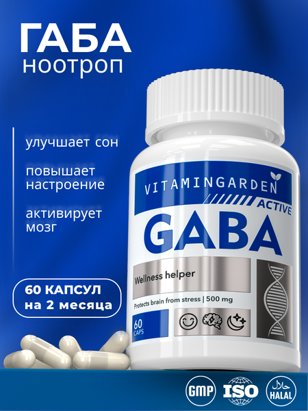 Линейка ACTIVE — современные нутрицевтики, созданные специально для людей с активным образом жизни. В составе активные формы витаминов, хелаты минералов и симбиотик нового поколения. Уникальные формулы с максимальной концентрацией ингредиентов обеспечивают высокую эффективность каждого комплекса. Продукты линейки поддержат организм при физических и умственных нагрузках, а также в период стрессов. VITAMIN GARDEN ACTIVE — оптимальный выбор для всех, кто стремится к лучшим результатам в карьере и спорте, заботится о своем здоровье и не готов к компромиссам. GABA — комбинация гамма-аминомасляной кислоты и витамина В6, созданная для поддержки мозга и нервной системы в период повышенных умственных нагрузок, напряжения и стресса. В каждой капсуле 500 мг аминокислоты — высокая дозировка, разрешенная в России. Повышает настроение Улучшает сон Активизирует мозг Повышает настроение Гамма-аминомасляная кислота (ГАМК) — это основной тормозной нейромедиатор в мозге человека. Она контролирует уровень возбуждения нервной системы и облегчает расслабление. Низкий уровень аминокислоты в организме был обнаружен в исследованиях у мужчин и женщин с депрессией и расстройствами настроения. Витамин В6 (пиридоксин) участвует в выработке ГАМК и других нейромедиаторов — «гормона счастья» серотонина и «гормона удовольствия» дофамина. Комплекс из 500мг ГАМК и пиридоксина действует как натуральный антидепрессант: поддерживает психоэмоциональный баланс, дает ощущение внутреннего спокойствия, предупреждает перепады настроения и развитие хронической усталости. Улучшает сон Гамма-аминомасляная кислота как тормозной нейротрансмиттер подавляет активность клеток, которые отвечают за бодрствование. Это особенно важно для людей, у которых расстройства сна связаны с тревожностью и стрессом, поэтому нервы не расслабляются перед сном естественным образом. Аминокислотный комплекс успокаивает нервную систему, облегчает засыпание, способствует длительности глубокой фазы сна, во время которой организм восстанавливается и набирается сил. Поэтому добавки с гамма аминомасляной кислотой (ГАБА) часто используют при занятиях спортом. В составе спортивного питания амино кислоты способствуют выносливости и восстановлению мышц, которое происходит во время сна. В6 необходим для выработки «гормона сна» мелатонина, отвечающего за улучшение сна и регуляцию циркадных ритмов — биологических часов организма. Активизирует мозг Исследования показали, что ГАМК играет важную роль в регуляции активности мозга и в реакции нейронов на «входящие сигналы», то есть восприятии информации из окружающего мира. Ученые установили связь между гамма-аминомасляной кислотой и познанием, мышлением, рабочей памятью. С возрастом синтез кислоты в организме снижается, что ослабляет когнитивные функции: память, концентрацию внимания, способности к обучению. Но недостаток ГАМК можно компенсировать при помощи БАДов (габба). Витамин Б6 важен для синтеза и метаболизма нейромедиаторов, которые передают сигналы между нейронами. А правильная и быстрая передача сигналов — залог продуктивной работы мозга. Удобный прием Принимайте по 1 капсуле в день перед сном. Рекомендуемый курс 3 месяца. При необходимости прием можно повторить. БАД. Не является лекарственным средством. Имеется сертификация по 