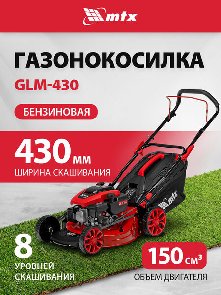 Газонокосилка бензиновая MTX GLM-430, 43 см, 3.5 л. с, 150 см3, 8 уровней скашивания от 25 до 75 мм и 4 режима: сбор в травосборник 45 л, боковой и задний выброс и мульчирование, 58830