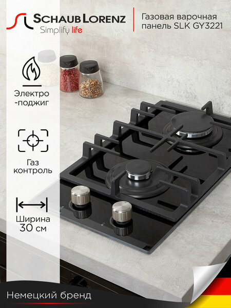 Газовая варочная панель Schaub Lorenz SLK GY3221 - это современное и функциональное решение для вашей кухни. С ее помощью вы сможете готовить разнообразные блюда с максимальным комфортом и безопасностью. Панель выполнена из закаленного стекла черного цвета, что придает ей стильный и современный вид. Материал панели устойчив к высоким температурам и механическим повреждениям, что гарантирует долгий срок службы. Прочная чугунная решетка обеспечивает стабильность и надежность при использовании. Она не скользит и плотно прилегает к поверхности, что предотвращает случайное перемещение посуды. Система газ-контроля гарантирует безопасность использования. Если пламя случайно погаснет, система автоматически перекроет подачу газа, предотвращая утечку. Автоматический электроподжиг позволяет быстро и легко зажигать конфорки. Вам не придется тратить время на поиск спичек или зажигалок. Панель оснащена двумя конфорками, одна из которых является экспресс-конфоркой. Это позволяет быстро разогреть или вскипятить воду, что особенно актуально в утренние часы. Варочная панель имеет компактные размеры (ширина 30 см, глубина 51 см) и подходит для установки в небольших кухнях. Панель имеет возможность работы от газового баллона, что делает ее удобной для использования в загородных домах или на дачах. Руководство по эксплуатации, руководство по подключению и гарантийный талон входят в комплект поставки, что обеспечивает удобство и безопасность использования. Выбирая газовую варочную панель Schaub Lorenz SLK GY3221, вы получаете современное, функциональное и безопасное решение для вашей кухни.
