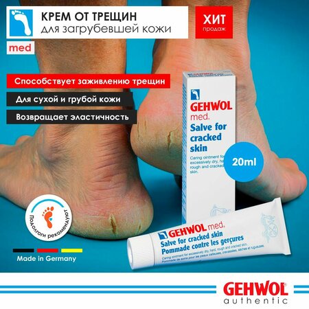 Профессиональная мазь от трещин Геволь подойдет для ухода за сухой, потрескавшейся, загрубевшей и повреждённой кожей. В составе – пантенол, бисаболол, питательные жиры и натуральные эфирные масла лаванды, розмарина и эвкалипта, которые оказывают противовоспалительное действие и ускоряют процесс заживления трещин на руках и ногах. Регулярное применение этого средства защитит потрескавшуюся кожу от инфицирования и шелушения, облегчит её болезненное состояние и возвратит естественную эластичность. Мазь от трещин от бренда Gehwol также размягчает натоптыши разной степени сложности за счет кастората калия и питательных жиров (ланолина) в составе. Рекомендуется к применению для ухода за диабетической стопой и за стопами с загрубевшей и мозолистой кожей. Может использоваться для рук, как средство, заживляющее поврежденную кожу. «Вы приобретаете продукцию у официального дистрибьютора Gehwol на территории РФ. Вся продукция имеет максимально свежие сроки годности, разрешающие документы, сертификаты! Спасибо, что остаетесь с нами на протяжении 30 лет работы на территории РФ.»