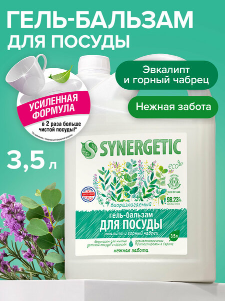 Гель-бальзам для мытья посуды SYNERGETIC "Эвкалипт и горный чабрец" – это экологичное и безопасное средство для мытья посуды, кухонного инвентаря и детских игрушек. Объем составляет 3,5 литра, что делает его экономичным и удобным в использовании. Средство эффективно удаляет жир, сложные загрязнения и неприятные запахи даже в холодной воде. Благодаря комплексу биоразлагаемых ПАВ из растительного масла и энзимов, гель-бальзам полностью смывается водой и не оставляет следов на посуде. Растительный глицерин в составе средства обеспечивает защиту кожи рук от сухости и раздражения. Экстракты ламинарии и спирулины активно питают и увлажняют кожу, делая ее более мягкой и эластичной. Гипоаллергенная парфюмерная композиция с эфирными маслами эвкалипта, пихты, кеда и апельсина придает средству нежный и приятный аромат. Гель-бальзам подходит для мытья всех видов посуды, включая детскую, стеклянную, серебряную и фарфоровую. Он также может быть использован для мытья фруктов и овощей, а также для ухода за детскими игрушками. Продукт производится в России и не содержит искусственных красителей, хлора и ГМО. Способ применения прост: нанесите средство на очищаемую поверхность или губку, вымойте поверхность, ополосните водой. При приготовлении моющего раствора используйте 5 мл средства на 5 л воды.
