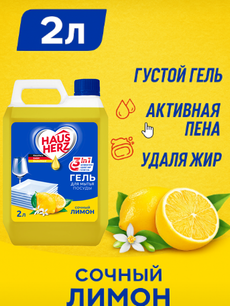 Гель для мытья посуды Haus Herz «Сочный лимон», 3в1, гипоаллергенный, 2л