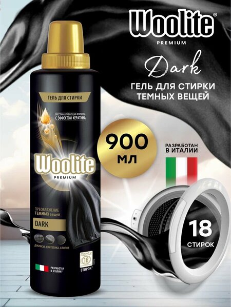 Гель для стирки Woolite Premium Dark 900 мл Назначение: средство моющее синтетическое жидкое для стирки белья и одежды. Подходит для всех типов тканей, кроме деликатных (шерсти и шелка). Для автоматических стиральных машин и ручной стирки. Для темных, черных изделий и изделий из джинсовых тканей. Woolite Premium Dark с кератином - это жидкое средство для стирки, которое ухаживает за вашими темными вещами. Уникальная формула с кератином помогает избавиться от катышков и ворсинок на ткани, которые образуются во время носки и стрики одежды, возвращая изначальную насыщенность цвета и яркость. Разглаживает грубые волокна ткани. Способ применения: Ручная стирка на 5 л воды - добавить 33 мл Woolite. Для стирки в автоматических стиральных машин 2-3 кг белья для слабых загрязнений добавить 50 мл средства, средних - 80 мл, сильных - 100 мл. Для 4-5 кг белья для слабых загрязнений добавить 70 мл средства, средних - 100-130 мл, сильных - 150 мл. Для 5-7 кг белья для слабых загрязнений добавить 100 мл средства, средних -