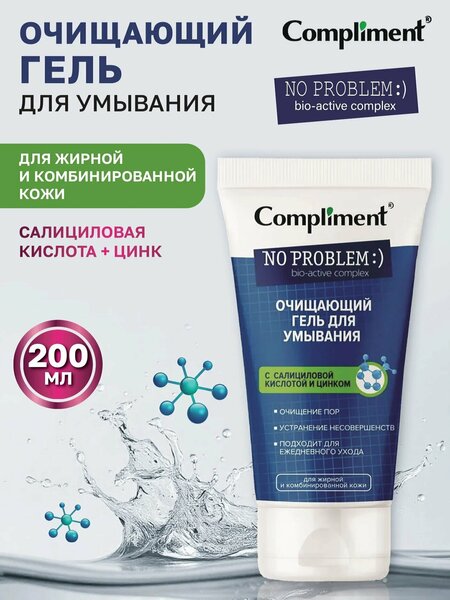 Гель для умывания, COMPLIMENT, Очищает кожу , освежает и делает кожу мягкой, удаляет черные точки и сужает поры ,200 мл