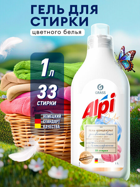 Гипоаллергенный универсальный гель для стирки цветного белья Grass Alpi Color 1литр на 33 стирки – экологичное, гипоаллергенное средство. Alpi для цветных вещей открывается древесно-цитрусовым ароматом, переходя в аромат ландыша и жасмина, с послевкусием ванили. Благодаря уникальному комплексу компонентов из Германии в составе Альпи, гарантировано бережное и эффективное очищение тканей. Его можно использовать как для ручной, так и машинной стирки автомат в воде любой жесткости. Рекомендуемая температура – до 60 градусов. Активный жидкий порошок для стирки подходит для вещей из разных тканей: хлопка, льна, атласа, поплина, сатина, денима, шелка, кашемира и других. Идеально подходит для очищения цветных вещей, не оставляет следов и разводов на одежде, а также сохраняет цвет и предотвращает перенос красителя. Концентрированный гель для стирки белья не имеет в составе агрессивных и других вредных компонентов. Он не провоцирует развитие аллергической реакции, за счет чего можно использовать и для детского белья (0+). Средство для стирки полностью выполаскивается из тканей. Оно обладает приятным нежным ароматом и подходит для шерстяных изделий, пуховиков и верхней одежды из мембраны, платьев, спортивной экипировки, джинсовых вещей. Использовать гель Grass для стирки просто: налить в отсек для порошков из расчета один мерный колпачок на 3-4 кг белья. Если требуется устранить сложные, застарелые пятна (к примеру от ягод травы вина крови), непосредственно перед стиркой на них наносят средство. Гель для стирки Альпи для цветного 1л – оптимальный объем, его расход экономнее, чем таблетки пластины и капсулы для стирки. Grass для стирки – незаменимое средство, которое должно быть в доме у каждой хозяйки. Одежда и обувь после него сохраняет свой первоначальный вид (структура не нарушается). В ходе исследований и тестирований средство доказало свою безопасность. Бытовая химия Грасс станет отличным подарком близких, в подарочном наборе его могут дополнить жидкое мыло, пятновыводитель моющие и чистящие средства для дома.