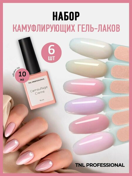 Набор из 6 гель-лаков, каждый по 10 мл. Камуфлирующий нюдовый гель лак для ногтей Camouflage Creme от TNL professional для ценителей естественного маникюра и френч дизайна. Гель-лак для маникюра имеет среднюю вязкость и не растекается при нанесении, высокопигментированный, идеально ложится даже в один слой. Идеально корректирует эстетические несовершенства натуральных ногтей. Гель лак можно использовать как самостоятельное покрытие или в качестве подложки для французского маникюра. Коллекция камуфляжных гель-лаков для ногтей TNL Camouflage Creme - это нежный нюдовые оттенки для максимально натурального маникюра. Подбирайте оттенки и создавайте нейл арт своей мечты! *Технология нанесения: Снимите покрытие фрезером или пилкой 180/240 грит. Придайте ногтям необходимую форму, зашлифуйте, используя баф. Нанесите ремувер для удаления кутикулы. Используя апельсиновые палочки, сдвиньте кутикулу с ногтевой пластины и удалите оставшуюся часть кутикулы Обезжирьте ногтевую пластину и нанесите праймер или обезжириватель. Нанесите базу для гель лака и сушите в LED/UV-лампе по инструкции В два слоя нанесите цветной гель лак и сушите каждый слой по отдельности в LED-лампе 1 минуту, в UV-лампе 2 минуты. Далее можно выполнить дизайн с помощью гель краски, фольги, стемпинга, наклейки, слайдера, поталью, прикрепить декор и стразы, нарисовать неоновый или серебристый френч Нанесите топ для гель лака и сушите в LED/UV-лампе по инструкции. Создавайте свой дизайн, комбинируя гель лак с такими видами гелевой продукции, как: молочный, нюдовый/нюд/milk, светоотражающий гель лак, кошачий глаз, с шиммером, с поталью, с блестками, неоновый, витражный; с базовым и финишным покрытием, камуфлирующий полигель и акригель, цветная база, бордовый, коричневый, розовый, синий, зеленый, бежевый, серебряный, серый. Цвета шеллака могут незначительно отличаться, так как цветопередача на всех устройствах, гаджетах разная, ориентируйтесь на дополнительные фото и отзывы.
