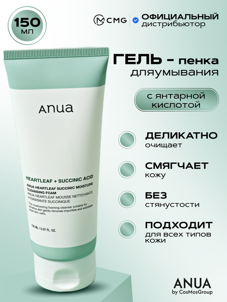 Гель-пенка для умывания Anua Heartleaf Succinic Moisture Cleansing Foam с янтарной кислотой объемом 150 мл предназначена для деликатного и эффективного очищения кожи. Продукт обладает слабокислотной формулой, которая поддерживает нейтральный кислотно-щелочной баланс и подавляет рост бактерий. Благодаря этому, гель-пенка мягко очищает кожу, не вызывая сухости и стянутости. Особенностью данного средства является его способность восполнять недостаток влаги в сухой и обезвоженной коже. После умывания кожа остается напитанной и увлажненной, что делает ее мягкой и гладкой на ощупь. В состав гель-пенки входят такие активные компоненты, как янтарная кислота, салициловая кислота, хитозан, запатентованный комплекс HEARTEASE и другие. Они мягко отшелушивают ороговевший слой эпидермиса, стимулируют процессы жизнедеятельности клеток, очищают поры, осветляют черные точки и сальные нити, растворяют комедоны и восстанавливают гидролипидный барьер. Продукт подходит для сухой, нормальной и обезвоженной кожи, обеспечивая ей глубокое очищение и увлажнение.