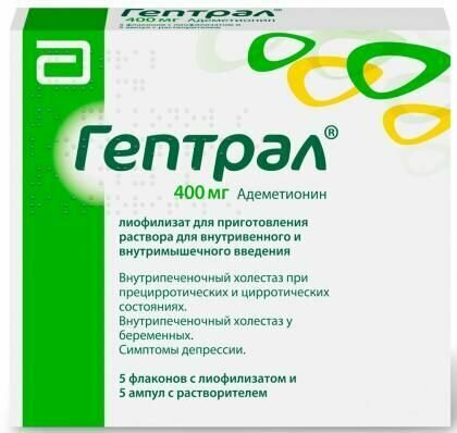 Внутривенно и внутримышечно. Перед применением лиофилизат для внутримышечного и внутривенного введения следует растворить с использованием прилагаемого растворителя. Остаток препарата должен быть утилизирован. Соответствующую дозу препарата для внутривенного введения далее следует растворить в 250 мл физиологического раствора или 5% раствора глюкозы и ввести медленно в течение 1-2 часов. Препарат нельзя смешивать со щелочными растворами и растворами, содержащими ионы кальция. В случае если лиофилизат имеет цвет, отличный от почти белого до белого с желтоватым оттенком (вследствие трещины во флаконе или воздействия тепла), препарат Гептрал использовать не рекомендуется. Начальная терапия: Рекомендуемая доза составляет 5-12 мг/кг/сут внутривенно или внутримышечно. Депрессия От 400 мг/сутки до 800 мг/сутки (1-2 флакона в сутки) в течение 15-20 дней. Внутрипеченочный холестаз От 400 мг/сутки до 800 мг/сутки (1 -2 флакона в сутки) в течение 2-х недель. При необходимости поддерживающей терапии рекомендуется продолжить прием препарата Гептрал в виде таблеток в дозе 800-1600 мг/сутки на протяжении 2-4 недель. Терапия препаратом Гептрал может быть начата с внутривенного или внутримышечного введения с последующим применением препарата Гептрал в виде таблеток или сразу с применения препарата Гептрал в виде таблеток. Пациенты пожилого возраста Клинический опыт применения препарата Гептрал не выявил каких-либо различий в его эффективности у пациентов пожилого возраста и пациентов более молодого возраста. Однако, учитывая высокую вероятность имеющихся нарушений функции печени, почек или сердца, другой сопутствующей патологии или одновременной терапии с другими лекарственными средствами, дозу препарата Гептрал пожилым пациентам следует подбирать с осторожностью, начиная применение препарата с нижнего предела диапазона доз. Почечная недостаточность Имеются ограниченные клинические данные о применении препарата Гептрал у пациентов с почечной недостаточностью, в связи с этим рекомендуется соблюдать осторожность при применении препарата Гептрал у таких пациентов. Печеночная недостаточность Параметры фармакокинетики адеметионина сходны у здоровых добровольцев и у пациентов с хроническими заболеваниями печени. Дети Применение препарата Гептрал у детей противопоказано (эффективность и безопасность не установлены).