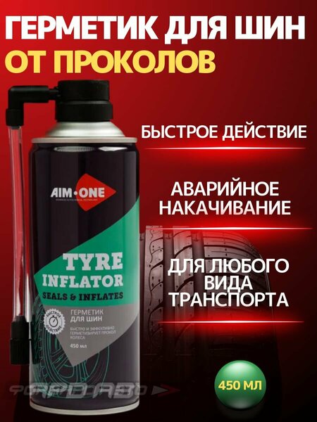 Tyre Inflator — быстродействующий герметик для шин, который устраняет проколы диаметром до 5 мм. Продукт незаменим на дороге: прост и удобен в использование, без применения специального инструмента, о Герметик для быстрого ремонта шин обладает уникальной формулой, которая позволяет заполнять и заклеивать маленькие проколы и микро трещины на поверхности шин, обеспечивая надежную герметизацию и предотвращая дальнейшие утечки воздуха. Применение герметика очень простое. Достаточно встряхнуть баллон и равномерно распылить его содержимое в шину. Герметик быстро проникает в место прокола, склеивает его и создает прочную уплотняющую пленку. AIM-ONE 450 мл. также обладает свойством расширения при взаимодействии с воздухом, что позволяет заполнять даже большие проколы до 5 мм в диаметре. Таким образом, герметик может быть использован для надежного устранения проколов как во время движения, так и в стоячем состоянии автомобиля. Герметик автомобильный действуеТ только в самом месте прокола. Автогерметик предлагается в удобном баллоне, оснащенном специальным механизмом для заправки в шины через стандартный ниппель. Состав образует внутри покрышки прочную и стойкую вулканизирующую пленку, которая обволакивает резину и заполняет все неровности, включая небольшие проколы. Тем самым восстанавливается герметичность шины. После применения достаточно проехать на автомобиле небольшое расстояние, чтобы средство оптимально распределилось по поверхности резины. Продукт не токсичен, не наносит вреда резиновым материалам, не нарушает баланс колес. Tyre Inflator рассчитан на любительское использование: он позволяет устранить дефект в аварийном режиме, не имея специальных навыков и инструментов для ремонта. Клей герметик удобен и прост в применение. Герметик для резина зимняя быстро действует. Герметик антипрокол: