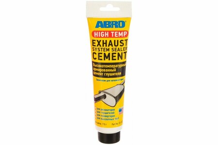 Цемент глушителя ABRO выдерживает температуру до 1100°С и идеален для сборки герметичных соединений в новых выхлопных системах, для устранения небольших дырок и трещин в глушителях, выхлопных трубах, каталитических конвертерах, резонаторах и т. д. Может с успехом применяться и в бытовых целях как высокотемпературный клей. Способ применения: Тщательно зачистить обрабатываемые поверхности от масла, окалины, жира и ржавчины. Нанести требуемое количество цемента и заделать дыры и трещины. При заделке обширных повреждений рекомендуется укрепить снаружи ремонтируемое место металлической сеткой. Схватывание цемента происходит через 20 минут работы двигателя на холостом ходу или без нагрева через 12 часов. Меры предосторожности: оказывает раздражающее действие! Избегайте попадания в глаза и продолжительного воздействия на кожу. В случае попадания в глаза или на кожу, тщательно промойте водой. В случае проглатывания, обратитесь к врачу.