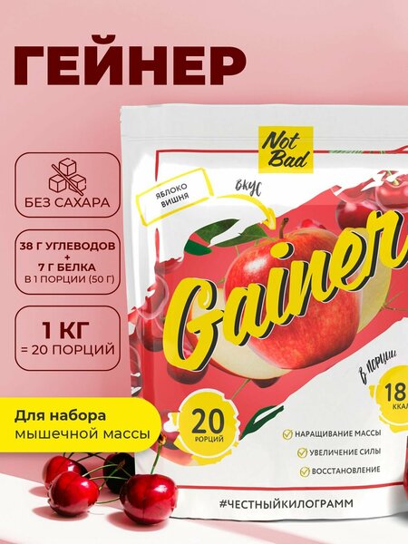 Гейнер (Gainer): Концентрат сухой быстрорастворимый для приготовления безалкогольного напитка: Коктейль NotBad Gainer со вкусом. Набрать массу и стать сильнее? Легко! Коктейль с повышенной калорийностью NotBad Gainer справляется с этой задачей на раз. В его основе четыре вида углеводов (мальтодекстрин, амилопектин, декстроза и рисовая мука), которые подпитывают тело энергией и равномерно восстанавливают запасы гликогена. Входящие в состав белки молочной сыворотки обеспечивают мышцы необходимыми аминокислотами для роста и развития силовых показателей. Используя сочетание NotBad Gainer с Creatine (креатин моногидрат) и Whey Protein (сывороточный протеин / белковый коктейль), вы достигните великолепного результата в наборе массы быстрее, чем могли бы пожелать.