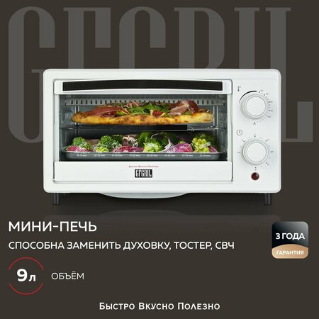 Многофункциональная мини печь GFO-09W станет настоящим помощником на кухне для тех, кто ценит свое время и любит питаться вкусно и полезно. Данная мини-печь подходит для приготовления совершенно разнообразных блюд – мяса, запеченных овощей, десертов, выпечки и многого другого. Компактная мини-печь может заменить такие приборы, как тостер, микроволновая печь (СВЧ), сэндвичница, и даже духовой шкаф. Духовка объемом 9 литров и мощностью 1 000 Вт обеспечивает высокую скорость нагрева, что позволит не только приготовить, а также и быстро разогреть готовые блюда. Блюда приготовленные или разогретые в мини-печи гораздо полезнее, чем разогретые в СВЧ, так как продукты при запекании сохраняют витамины. В мини-печи установлено два нагревательных элемента, температуру которых Вы можете регулировать в диапазоне от 100 до 250°С. Исходя из рецепта Вашего блюда, Вы можете выбрать уровень высоты для запекания - их всего три. В комплектации есть решетка и противень. Решетку следует использовать для размещения кухонной посуды, форм для выпечки, для запекания, жарки или размораживания продуктов. Противень подойдет для выпекания и жарки, а также в качестве поддона для сбора жира или крошек. Духовая печь электрическая оснащена удобным таймером, который позволит вам выбрать время приготовления и оповестит звуковым сигналом, когда время выйдет. Таймер можно установить с помощью поворотного регулятора от 5 до 60 минут. Дверца мини-печи стеклянная, что позволяет наблюдать за процессом приготовления Вашего блюда. Электрическая мини печь выполнена в стильном дизайне и подойдет к любому интерьеру. Внутреннее покрытие печи сделано из оцинкованной стали, а внешнее из высококачественного металла. Материалы не впитывают пищу, потому мини-печь легко мыть и достаточно протереть влажной салфеткой или губкой без сильнодействующих химических средств. Внешние размеры данной модели: 370*264*213 мм, вес: 2,6 кг. Благодаря своим компактным размерам мини-печь не занимает много места на кухне и её можно брать с собой на дачу. Творите свои кулинарные шедевры и наслаждайтесь вкусной едой вместе с мини-печью GFO-09W от GFGRIL! . . . . Мини-печь; духовка электрическая настольная; духовой шкаф; духовка; электрическая печь; печь; электропечь; электрошашлычница; мультипечь; чудо печь; мини духовка