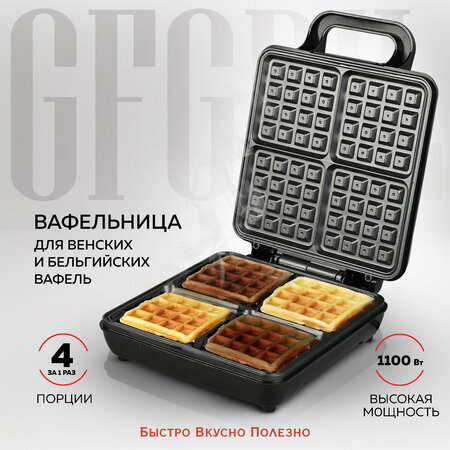Электрическая вафельница для венских и бельгийских вафель GFGRIL GFW-036, 4 вафли Электрическая вафельница GFW-036 поможет Вам приготовить сразу 4 ароматные, вкусные, хрустящие бельгийские или венские вафли за 1 раз. Тем самым вы экономите Ваше время – всего несколько минут и у вас сразу 4 вкуснейшие вафли или 2 необычных и сытных вафельных сэндвича с Вашей любимой начинкой! Благодаря высокая мощность 1100 Вт и двустороннему нагрев панелей вафельница быстро нагревается и равномерно готовит венские вафли, бельгийские вафли по Вашему рецепту. Электровафельница поможет Вам приготовить венские, бельгийские, шоколадные, диетические, овощные, протеиновые вафли. Благодаря современному дизайну и корпусу со вставками из нержавеющей стали вафельница электрическая GFW-036 станет украшением и стильным акцентом на любой кухне. Индикаторы включения и нагрева покажут, когда элетровафельница готова к работе. Прорезиненные ножки не дадут прибору скользить по столу во время готовки. Встроенные терморегуляторы защитят вафельницу от перегрева. Вафельница для венских вафель имеет качественное антипригарное покрытие, которое предотвратит пригорание теста и обеспечит легкий уход после использования. Благодаря оптимальным размерам (25,0*32,5*10,0 см) вафельница для бельгийских вафель не займет много места на кухне. Экологически чистые, безопасные и качественные материалы. Вафельница для кухни GFW-036 станет Вашей незаменимой помощницей в приготовлении вкусных вафель (венские вафли, бельгийские вафли) и отличным подарком для друзей и родственников, которые ценят настоящую домашнюю выпечку! Наша электровафельница поможет Вам приготовить вкусный завтрак, обеспечит правильное питание и подойдет тем, кто придерживается здорового питания. Вафельница электрическая, вафельница электрическая, сендвичница, вафельница для бельгийских вафель, вафельница, бутербродница электрическая, электровафельница для венских вафель, орешница электрическая вафельница, электровафельница, вафельница, бельгийские вафли, вафельница с антипригарным покрытием.