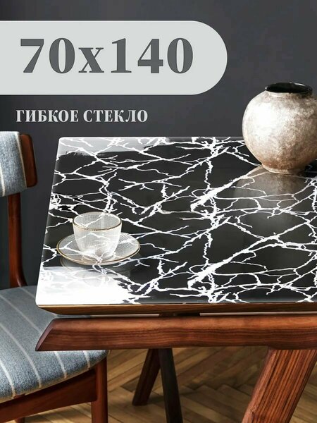 Гибкое стекло ПВХ с рисунком "Черный Мрамор и Серебро" / Размер 70 на 140 см / Скругленные углы