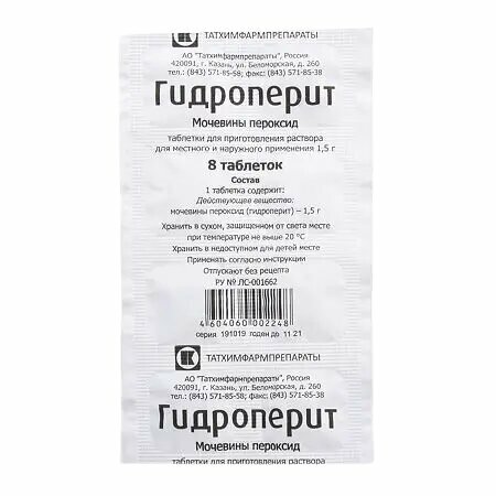 1 таблетка для приготовления раствора для местного применения содержит: действующее вещество: гидроперит 1,5 г.
