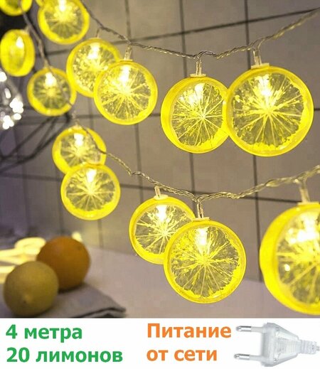 Гирлянда интерьерная светодиодная, LED в форме лимонов - красивое световое украшение для дома на праздники совместно с воздушными шарами создаст неповторимую атмосферу. Состоит из прозрачных плафонов в виде прозрачных долек лимона, подсвечивающихся светодиодами с теплым цветом свечения. Цвет кабеля- прозрачный. Длина гирлянды 4 метра. Количество светодиодов (лимонов) 20 шт. Диаметр лимона 5 см. Гирлянда работает от сети 220 В. Гирлянды можно соединять последователь в одну цепь.