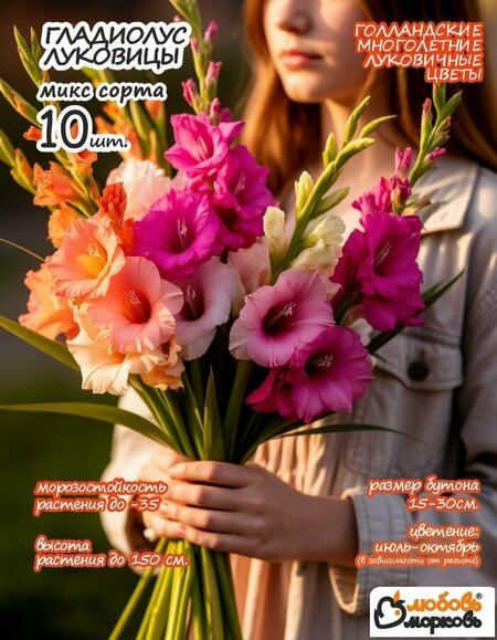 Гладиолус Микс сортов(в наборе сорта: флево бриз, флево сигнал, парпл флора и флево солар). Высота растения до 150. Цветок крупный. Диаметр цветка до 15 см. Гладиолусы - это род декоративных многолетних цветковых растений семейства ирисовых. Луковицы гладиолуса состоят из множества слоев, каждый из которых является необходимым звеном в процессе роста и развития растения. Они являются жизненным центром каждого растения, обеспечивая его стабильность и здоровье. Гладиолусы привлекают внимание своими яркими и разнообразными цветами, а их грациозные цветоносы удивляют своей величественностью. В роду гладиолусов насчитывается более 200 различных видов. Они известны своей неприхотливостью и способностью адаптироваться к различным климатическим условиям. Цветение этого растения происходит летом и осенью. Гладиолусы – это настоящая находка для любителей цветоводства и садоводства. Их красота и изящество притягивает взгляды и создает неповторимую атмосферу в саду. С посадкой гладиолусов связано много труда и усилий, но результат стоит всех вложений. Поэтому, несмотря на сезонность и определенные трудности, гладиолусы остаются одними из самых популярных цветов в мире.