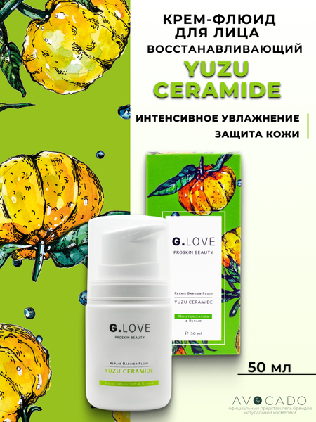 Крем-флюид G.Love Repair Barrier Fluid Yuzu Ceramide интенсивно восстанавливает сухую, обезвоженную и повреждённую кожу, повышает устойчивость к внешним раздражителям, поддерживает гладкость и эластичность рельефа. Средство оказывает укрепляющее действие, стимулирует заживление ранок и микроповреждений, увлажняет и способствует удержанию влаги за счёт восстановления естественного защитного барьера, препятствующего проникновению вредных веществ. Флюид разглаживает, смягчает, успокаивает раздражение, делает кожу упругой и бархатистой, стимулирует барьерные функции эпидермиса, устраняет сухость и шелушение, защищает от внешнего воздействия. Продукт имеет нежную кремовую текстуру и тонкий цитрусовый аромат. Упаковка, созданная по технологии AirFree, не пропускает воздух, обеспечивая надёжную защиту активов от окисления, что позволяет использовать меньше консервантов для стабилизации формулы. Один из главных компонентов — фруктовый церамид, содержащийся в экстракте юдзу, схожий с церамидами кожи, который укрепляет гидролипидный барьер и разглаживает мелкие морщинки. Экстракт юдзу также борется с процессом окисления, защищая клетки от свободных радикалов, и подавляет гликацию, то есть склеивание волокон коллагена молекулами сахара, благодаря чему уменьшает глубину морщин.