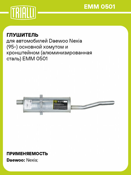 Глушитель для автомобилей Daewoo Nexia (95-) основной хомутом и кронштейном (алюминизированная сталь) Характеристики: Артикул: EMM 0501 OEM номера: 96180144 Количество на автомобиль: 1 Материал: Алюминизированная сталь Гарантийный срок: 2 года/60 тыс. Особенности конструкции: Шумопоглощающая набивка E-GLASS Длина изделия (мм): 1068 Длина корпуса камеры (мм): 500 Форма изделия: Овал Диаметр перфор. трубы (мм): 45 Диаметр корпуса D-1 (мм): 171 Диаметр корпуса D-2 (мм): 97 Товарная линейка: BLACK Дополнительная информация: Этикетка изделия может отличаться от представленной на фото Сопутствующий товар: Глушители основные/глушители дополнительные (резонаторы): EAM 0501, EAM 0503, EAM 0509 Сопутствующий товар: Трубы газоприемные: ECP 0502; ERP 0501; ERP 0502; ERP 0516, ECP 0512 Подходит для авто: Daewoo Nexia (94-), Nexia (94-) Для проверки применяемости отправьте VIN автомобиля через вкладку "Есть вопросы о товаре?" Комплектация: Глушитель основной - 1 шт. Гарантия: от 1 года.