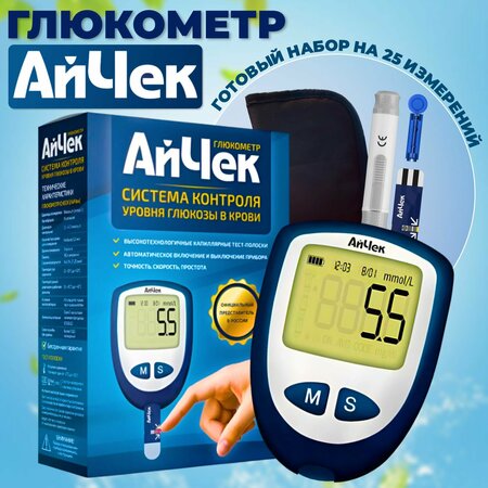 Глюкометр АйЧек (iCheck), Мягкий чехол для переноски, Тест-полосоки АйЧек (iCheck)- 25 штук, Устройство для прокалываения + 25 ланцетов АйЧек (iCheck), Батарейка CR 2032- 3 Вольта, Инструкция на русском языке