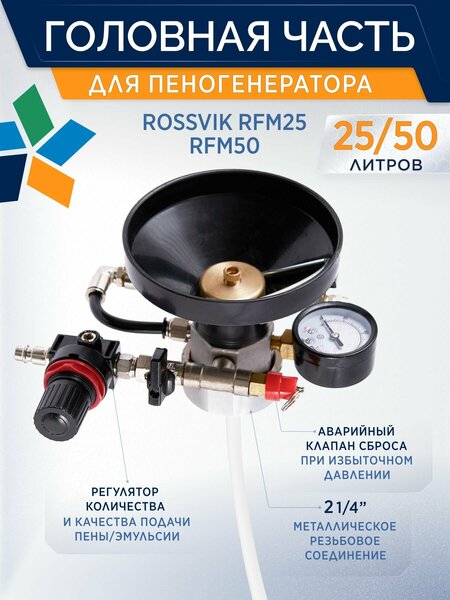 Головная часть для пеногенератора (горловина с манометром в сборе), предназначена для пеногенераторов ROSSVIK серии RFM25 и RFM50. Поставляется в сборе с регуляторами количества и качества подачи пены/эмульсии, так же аварийным клапаном сброса при избыточном давлении. Пеногенератор ROSSVIK RFM работает от сжатого воздуха, его можно легко подключить к пневмосети компрессора с давлением от 4-8 атм. Манометр и клапан регулировки давления обеспечивают точную настройку параметров подачи воздуха, а игольчатый клапан позволяет контролировать плотность пены. Это делает его идеальным решением для нанесения моющих и дезинфицирующих растворов даже на труднодоступные участки. В бак пеногенератора заливается моющее средство с водой (концентрация раствора в соответствии с рекомендациями производителя химии). На выходе из пеногенератора раствор смешивается с сжатым воздухом, в результате чего получается водо-воздушная смесь. Смесь по шлангу подается к пистолету, где на выходе пистолета с помощью форсунки превращается в густую и обильную пену. Особенности Экономия моющего средства (20-30 г. на мойку 1-го авто). Максимальная высота нанесения пены до 6 метров. Сокращение затрат времени на обработку поверхности (~5-6 мин. На мойку 1-го авто). Удобное нанесение: не нужно тратить время на замену копья на пенную насадку (в случае использования пенокомплекта).