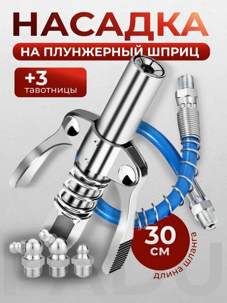 Насадка на плунжерный шприц / Наконечник для шприца смазки плунжерный со шлангом 30 см и 3-мя тавотницами