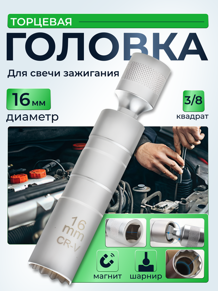 оловка торцевая свечная с магнитом и шарниром диаметром 16мм - это надежный и удобный инструмент для работы с свечами. Эта головка оснащена магнитом, который помогает предотвратить потерю свечи при выкручивании из цилиндрового блока. Благодаря данным характеристикам, ключ свечной на 16 мм станет незаменимым помощником при замене свечей на автомобиле или другой технике. Свечной ключ имеет шарнир, который обеспечивает удобный доступ к труднодоступным местам, что делает его идеальным инструментом для профессиональных механиков и автолюбителей. Ключ свечной на 16 мм позволяет быстро и легко заменять свечи, обеспечивая надежное соединение и эффективную работу двигателя. Эта головка торцевая идеально подходит для использования как в домашних условиях, так и в автосервисе. Благодаря своей прочной конструкции и удобству использования, ключ свечной на 16 мм станет незаменимым инструментом для любого автолюбителя или профессионального механика.