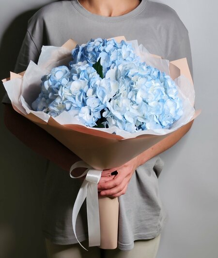 Букет из голубых гортензий: стильный и элегантный подарок Подарите радость и красоту с букетом из трех голубых гортензий. Этот стильный и элегантный монобукет станет отличным подарком для любого повода, будь то день рождения, день свадьбы, юбилей или просто знак внимания. Букет состоит из трех крупных голубых гортензий, которые отлично подойдут для подарка девушке, маме, коллеге или бабушке. Высота букета составляет 50 см, а ширина – 40 см, что делает его заметным и запоминающимся. Букет доставляется в стильной упаковке из голубой пленки, перевязанной лентой. Это придает букету аккуратный и законченный вид, а также защищает цветы от повреждений во время транспортировки. Для продления жизни цветов рекомендуется ежедневно подрезать их на 2-3 см, производить смену воды и ставить в прохладном месте, вдали от прямых солнечных лучей и сквозняков. Выбирайте букет из голубых гортензий для тех, кто ценит красоту, качество и стиль.