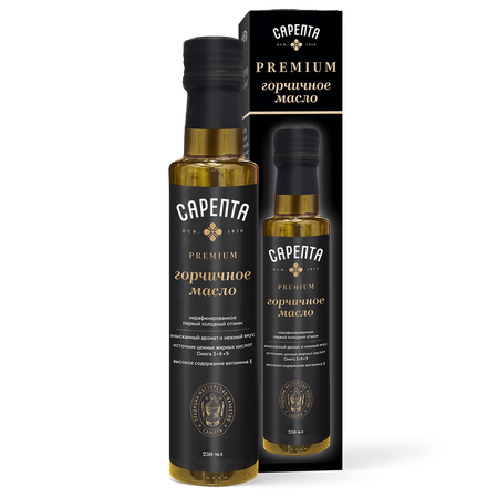 Горчичное масло линейки «Сарепта» PREMIUM — это элитное масло высшего качества, производится по старинным рецептам и уникальной технологии — с использованием метода холодного прессования отборных и выдержанных семян сарептской горчицы. Горчичное масло «Сарепта» PREMIUM — это нежный вкус и изысканный аромат настоящего горчичного масла, которое широко используется в блюдах русской, европейской и восточной кухни. Горчичное масло «Сарепта» Premium, имеет международную сертификацию, а также соответствует требованиям Технического регламента на масложировую продукцию Таможенного союза Евразийского экономического союза, а также имеет сертификаты кошерности и халяль. Особенности: Нерафинированное; Первый холодный отжим; Источник жирных кислот омега-3•6•9 и витамина Е. Идеально подходит для салатов, жарки и выпечки. Не содержит ГМО. Имеет температуру дымления более 200 °С. Хранение: Хранить в закрытых затемненных помещениях. После вскрытия упаковки хранить при температуре не выше 20 °C в темном месте. Используется в кулинарии: Для заправки салатов; Для приготовления блюд из овощей и рыбы; Для придания пикантного вкуса, пышности и золотистого цвета хлебу и выпечке; Как ингредиент овощных консервов домашнего приготовления.