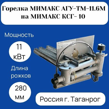 Горелка газовая АГУ-ТМ-11,6 М на Мимакс КСГ-10 Характеристики: Тип: горелка газовая Мощность: 11 кВт Подвод газа: левый боковой Диаметр подключения газа: 1/2" Длина термодатчика: L 470 мм Посадочное место: 2 шт Межосевое расстояние посадочного места: 16 см Размеры рамки (ВхШхГ): 16х20х28 см Количество горелок (рожков): 3 шт Описание: