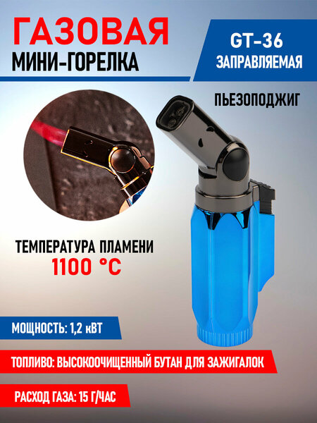 Газовая заправляемая горелка REXANT GT-36 с пьезоподжигом мощностью 1,2 кВт обладает небольшим расходом топлива: 15 г/час. Рекомендуется для работы с термоусаживаемыми трубками, перчатками, муфтами; для плавления и сварки изделий из пластиков и стекла; для снятия старой краски; для разморозки замков, водопроводных труб, продуктов; для копчения продуктов или карамелизации десертов; для работ в саду и огороде; для быстрого и экологичного поджига дров, розжига угля. Заправляется высокоочищенным газом бутаном для горелок; в рукоятке-подставке предусмотрена специальная емкость объемом 4 г. На корпусе размещен регулятор силы подачи топлива. Горелка работает в режиме турбо: имеет направленное пламя, более устойчивое при ветре. 4 положения угла наклона сопла позволяют подобрать наиболее оптимальное положение для работы. Туристическая горелка пригодится в походе и на пикнике. Устройство поставляется незаправленным. Максимальная температура пламени: 1100 градусов Цельсия. Для корректной заправки горелки необходимо следовать приложенной инструкции. Размеры: 52х29х22 мм Размер сопла: 7х7 мм Фиксация положения сопла: да Расход газовой смеси: 15 г/ч Время горения: 8 мин Топливо для заправки: бутан Тип поджига: встроенный пьезоэлектрический