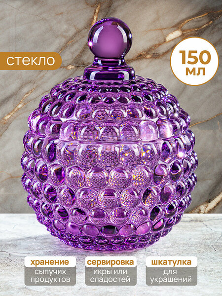 Горшочек для мёда “Пузырьки” с крышкой выполнен из стекла и украшен декоративным рельефным узором. Размер изделия – 8,5х8,5х11 см, объём – 150 мл. Высота без крышки – 5,2 см. Интересная баночка фиолетового цвета подойдёт для хранения мёда, варенья, сахара и соли. Можно использовать её как ёмкость для чая, кофе и других сыпучих продуктов. Декоративная баночка круглой формы станет гармоничным дополнением при сервировке вашего стола как в будни, так и на праздник. Красивый дизайн позволит использовать её не только для хранения продуктов, но и для подачи на стол. Положите в неё конфеты или икру, чтобы удивить гостей изящной сервировкой. Стеклянную ёмкость с крышечкой можно использовать не только как сахарницу, икорницу или соусник, но и для специй и приправ. Это позволит держать под рукой всё необходимое во время приготовления и приёма пищи. На даче медовница будет незаменимой для семейного чаепития, а также подойдёт для подачи ягод. В качестве альтернативы красивую вазочку с крышкой можно использовать как шкатулку. Сложите в неё украшения и любые маленькие предметы. Не рекомендуется применять абразивные моющие средства. Не использовать в посудомоечной машине и микроволновой печи. Поставляется в стильной картонной упаковке. Красивая посуда – это отличный подарок на любой праздник. Медовый бочонок “Пузырьки” станет многофункциональным дополнением вашего кухонного инвентаря и настоящим украшением кухни!