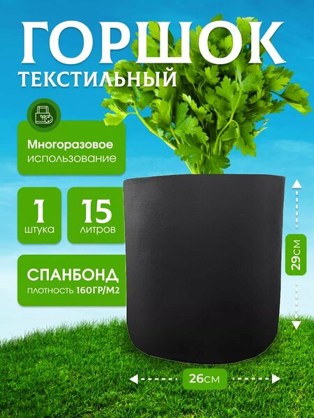 Текстильный горшок позволяет выращивать любое растение в более благоприятных условиях, чем в контейнерах из других материалов. · Основным преимуществом горшка из ткани, является способность пропускать воздух, тем самым обеспечивая доступ кислорода к корням растений. Данная особенность обеспечивает воздушную пикировку боковых корней, что в свою очередь провоцирует бурный рост всей корневой системы, делая растение выносливее. · Горшок тканевый препятствует засолению почвы и гниению корневой растений с помощью естественного дренажа (лишняя вода просто вытечет из горшка) · Не нужно выполнять тяжелую работу по перекопке и прополке Автоматическое поддержание оптимального газового, водного и температурного режима почвы в контейнере; Превосходная аэрация грунта способствует развитию благотворных почвенных микроорганизмов и подавляет размножение возбудителей заболеваний растений; Почвенные вредители не могут попасть в контейнер и причинить ущерб растениям; Благодаря автоматической пикировке корневая система развивается наилучшим образом; Могут применяться любые виды полива; Возможность получения урожая на 10-15 дней раньше, чем в традиционных горшках; Растения в горшках мешках могут быть перемещены в любое удобное место, например из теплицы в открытый грунт и обратно, легко транспортировать к месту выращивания или продажи. · Черный цвет материала позволяет равномерно прогревать и сохранять тепло в почве. · Содержание УФ-стабилизатора в составе материала позволяет защищать корневую систему от ультрафиолетовых лучей. · Горшки из ткани можно стирать и использовать повторно. · Мешок удобен в хранении.