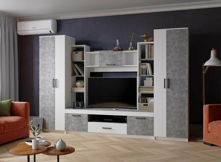 Габариты (ШхВхГ): 3000х2000х470 мм Ниша под ТВ: В850хШ1100х470 мм Направляющие — Роликовые Материал корпуса — ЛДСП Материал фасада — ЛДСП Цвет корпуса — Белый Цвет фасада — Комбинированный