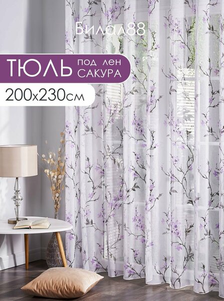 Готовый тюль под лен на шторной ленте с утяжелителем ширина 200 см высота 230 см; вуаль с рисунком