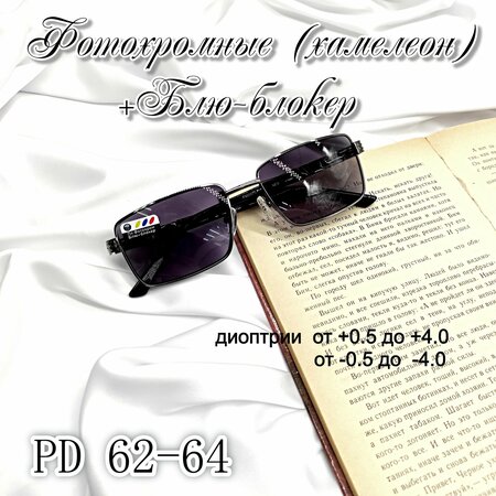Готовые очки для зрения фотохромные (хамелеон) с компьютерной защитой воплощение классики. Очки корригирующие – станут надежной опорой в повседневной жизни и уберут дискомфорт из нее. Очки универсальны в своем исполнении и считаются классикой, такая модель очков подойдет, как очки для женщин, так и для мужчин . Готовые очки прекрасно подойдут как компьютерные или для вождения. Также их можно использовать как очки для чтения. Оправа сделана из металла, линза - оптический полимер. Силиконовый носоупор обеспечивает удобную посадку, не скользит. Такие носоупоры выигрывают у аналогов за счет того, что принимают форму носа. Регулируется на разную ширину переносицы. Также у очков есть флекссистема, обеспечивающая удобную посадку оправы. Благодаря ей заушник не давит на височную долю головы и оправа не искривляется при снятии. В внутри помещения они полностью прозрачные, имея покрытие Blue Blok (компьютерная защита) – защита от электромагнитного излучения, бликов, вредного синего и фиолетового спектра. Очки снижают нагрузку на глаза. Итог - жжение, покраснение, слезотечение и неприятные симптомы снижаются. На улице фотохромные линзы набирают максимальное затемнение. Как работают фотохромные линзы? В этих линзах применяются альтернативные фотохромные молекулы-красители. Они умеют реагировать на ультрафиолетовое излучение. Когда светового воздействия нет, линзы осветляются. Фотохромные линзы активируются только под воздействием UV излучения входящего в состав видимого солнечного света. Очки прозрачные подчеркнут достоинства и станут прекрасным аксессуаром к любому комплекту одежды. Все очки имеют стандартное межзрачковое расстояние 62-64 мм. Очки для зрения доедут к вам целыми и невредимыми. Благодаря легкости и анатомичности оправы очки с диоптриями уже через несколько минут носки станут не заметными! Вы можете приобрести корригирующие очки в подарок на день рождения или просто так!