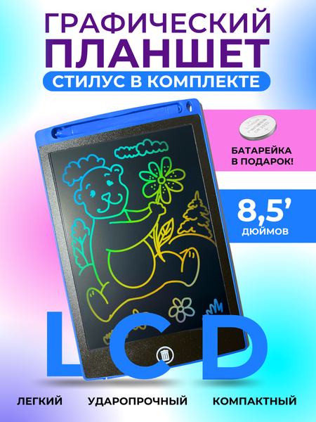 Графический электронный цветной планшет для рисования детский со стилусом 8,5 дюймов синий