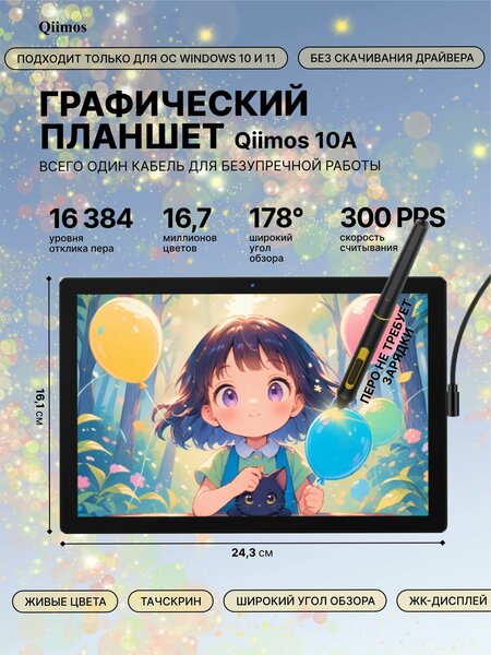 Графический планшет Qiimos 10A Работает с подключением к компьютеру на ОС WINDOWS 10 и выше ТАЧКСКРИН БЕЗ СКАЧИВАНИЯ ДРАЙВЕРА ВСЕГО ОДИН КАБЕЛЬ ДЛЯ БЕЗУПРЕЧНОЙ РАБОТЫ ПЕРО НЕ ТРЕБУЕТ ЗАРЯДКИ 16 384 уровня отклика пера 16,7 миллионов цветов 178° широкий угол обзора 300 PPS скорость считывания 1280*800 разрешение экрана 16,1 см * 24,3 см Почувствуйте абсолютный контроль с вашим графическим планшетом Qiimos 10A. Сенсорное управление делает работу невероятно удобной и простой. Точное управление пальцами, легкие касания и плавные движения позволяют увеличивать, уменьшать и вращать холст с максимальной точностью. Творите без границ! Экран мгновенно реагирует на ваши действия, помогая воплотить любые идеи. Создавайте, рисуйте и наслаждайтесь процессом с вашим идеальным инструментом для творчества! Поверхность с уникальным покрытием имитирует текстуру бумаги, создавая идеальный баланс между трением и плавностью движений. А антибликовое покрытие обеспечивает комфортную работу при любом освещении, защищая ваши глаза от усталости. Полностью герметичный корпус защищает экран от пыли и грязи, увеличивая его долговечность. Легкость и удобство для вашего творчества! Подключите планшет Qiimos 10A одним кабелем и забудьте о спутанных проводах, которые мешают творить. Встроенный драйвер избавит от поиска и скачивания — просто подключите, устанавливайте и работайте. Наслаждайтесь яркими цветами и четкими деталями под любым углом. Угол обзора 178° и IPS HD экран обеспечивают высокую точность без искажений, а плавное управление и удобный дизайн делают творчество простым и вдохновляющим. Идеален для художников и дизайнеров! Графический планшет Qiimos 10A — ваш универсальный инструмент для творчества. Совместим со всеми популярными приложениями для дизайна и рисования. Позвольте вдохновению летать свободно! Идеально для профессионалов и начинающих. Профессиональное перо Этот инструмент обеспечит легкость и удовольствие в работе благодаря передовым технологиям: 16 384 уровня чувствительности обеспечат максимальную точность для проработки деталей. Скорость считывания 300 PPS обеспечит синхронное отображение создаваемого изображения без задержек. Благодаря отсутствию необходимости заряжать перо, вы можете сосредоточиться на творчестве. Насладитесь плавным и естественным письмом за счет фетровых наконечников. Настройте кнопки под себя, используйте их как ластик, мышь или для прокрутки. РАЗМЕР КАК У КАРАНДАША ВЫСОКИЙ ОТКЛИК НЕ ТРЕБУЕТ ЗАРЯДКИ Живые цвета: уникальная цветопередача делает изображения максимально реалистичными и яркими, благодаря “живым” цветам. Широкий цветовой охват позволяет передать все оттенки с невероятной точностью. Глубокая цветовая палитра оживляет даже самые насыщенные детали, добавляя выразительности вашим работам. Безупречная чёткость: экран идеально отображает мелкие элементы, обеспечивая исключительную яркость и контрастность. 16,7 миллионов цветов (8 бит + FRC) 90% sRGB богатая цветовая гамма 1000:1 коэффициент контраста Комплектация Кабель для передачи данных Зажим для замены стержня 10 стержней Перо Графический планшет Qiimos 10A Чехол для аксессуаров Перчатка Руководство пользователя на русском языке