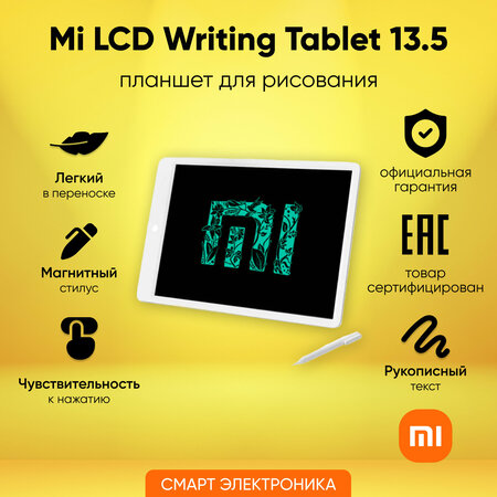 В планшете для рисования Mijia используется особая жидкокристаллическая пленка, на которой остаются четкие штрихи бирюзового цвета. В планшете сочетается четкость штрихов на обычной бумаге и гладкость письма на ЖК-дисплее. Технология высокой чувствительности к уровню нажима на дисплее позволяет интуитивно изменять толщину штриха - чем сильнее нажим на стилус, тем толще штрих. Кроме стилуса рисовать можно любыми другими предметами или даже пальцами, чтобы дать полную свободу своему творческому потенциалу. Сам дисплей не излучает свет, поэтому рисование на нем во многом похоже на рисование на бумаге: после длительного использования глаза ничуть не устанут. Кроме того, отсутствие жидких чернил и острых углов делает планшет Mijia полностью безопасным даже для детей. Особый жидкокристаллический дисплей работает с нулевым энергопотреблением, тратя лишь небольшой заряд во время очистки. Даже если каждый день сбрасывать рисунки по сто раз, всего одной плоской батарейки планшету Mijia хватит на целый год работы. Кнопка быстрой очистки позволяет быстро перейти к созданию нового шедевра. Стилус планшета весит всего 7 грамм, он оснащен мощными магнитами для прочного крепления. Корпус планшета толщиной всего 7 мм отличается малым весом и высокой мобильностью, позволяя проводить больше времени за рисованием в любом месте и в любое время.
