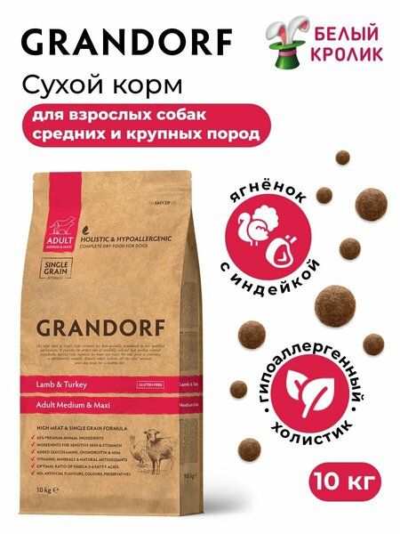 Сухой корм для собак средних и крупных пород Grandorf Adult Med/Maxi с Ягнёнком и Индейкой 10кг