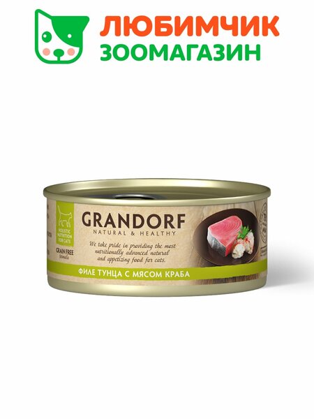 Консервы для кошек Grandorf Филе тунца с мясом краба 6x70 гр. Для кошек всех возрастов Полностью натуральное питание для кошек из отборного мясного филе, приготовленное в собственном соку. Только мясо и Ничего лишнего - отличное дополнение к сухим кормам, для разнообразия рациона питомца. Преимущества: Увеличенный % добавок (мясо краба) 100% натуральные и свежие ингредиенты 75% Мяса в составе (65% филе тунца, 10% мясо краба) 0% зерновых (Grain Free) Ингредиенты класса Human-Grade пригодные в пищу человеку Используются только филейные мясные и рыбные части Деликатный способ приготовления (cохранены все питательные вещества) Без гормонов, антибиотиков, консервантов, красителей, ароматизаторов и других добавок Рекомендации по кормлению: Подавать продукт комнатной температуры. Обеспечить животного питьевой водой. Подавать одну банку в день на 4 кг веса животного с нормальной активностью. Состав: 65% филе тунца, 10% мясо краба, 25% собственный сок, 0% зерновых. Гарантированный анализ: Протеины 16%, Жиры 0,1%, Клетчатка 0,2%, Зола 1%, Влажность 82,7%. Энергетическая ценность: 730 ккал/кг.