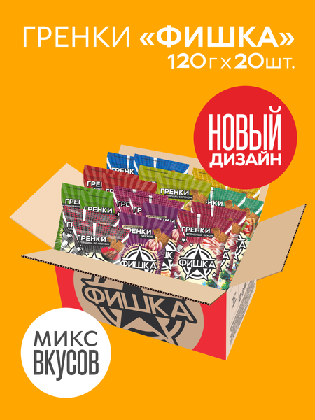 Гренки "Фишка" 120 г чесночные - 2 шт., Гренки "Фишка" 120 г со вкусом альпийской сметаны с луком - 2 шт., Гренки "Фишка" 120 г со вкусом сибирского холодца с хреном - 2 шт., Гренки "Фишка" 120 г со вкусом говядины по-японски - 2 шт., Гренки "Фишка" 120 г со вкусом икры красной - 2 шт., Гренки "Фишка" 120 г со вкусом сыра Гауда - 2 шт., Гренки "Фишка" 120 г со вкусом камчатского краба - 2 шт., Гренки "Фишка" 120 г со вкусом английского бекона - 1 шт., Гренки "Фишка" 120 г со вкусом итальянской пиццы - 2 шт., Гренки "Фишка" 120 г со вкусом маринованных огурчиков - 2 шт.