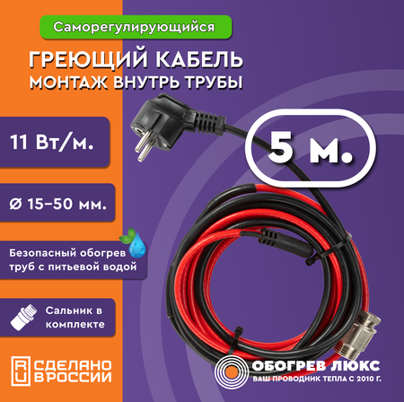Греющий кабель в трубу с сальником 5 м 11 Вт/м самрег для питьевого водопровода готовый комплект ТМ Обогрев Люкс