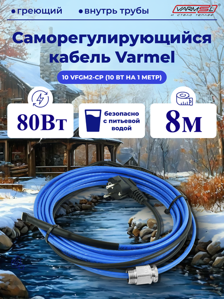 Саморегулирующийся кабель во внутрь трубы 10VFGM2-CP комплект с сальником. Для труб диаметром 32мм. Данный способ нагрева широко востребован как в разнообразных технологических процессах, так и в быту. Обогревающий кабель для труб можно использовать для поддержания заданной температуры, с монтажом внутри трубы. Системы кабельного нагрева трубопроводов изнутри используются, когда наружный обогрев труб неэффективен или невозможен, например, трубы расположены под землей; трубы проходят в воде; трубы с имеющейся изоляцией и т. д. Преимущества: Оболочка греющего кабеля 10VFGM2-CP - полипропилен, его можно использовать для питьевой воды, не вступает в химические взаимодействия с водой, соответственно не выделяет посторонних вкусов и запахов. 10 Вт - экономия электроэнергии Можно изготовить более длинные секции Тип кабеля: Саморегулирующий кабель Напряжение: 230 В ±10% Удельная мощность: 10 Ватт на погонный метр Длина нагревательного кабеля: 8 м Максимальная мощность готовой секции: 80 Вт Поперечный размер: 8*5 мм Диаметр муфты: 11 мм Изоляция матрицы: Полиэфин Наружная оболочка: полипропилен Водопроводная муфта: латунь (присутствует в комплекте) Диаметр водопроводной муфты: 1/2 Защитный экран (заземление): луженая медь Максимальная температура воздействия: 85°С Подводящий силовой кабель с вилкой: 3*1 мм² длина 2 м+ сальник Монтаж: внутри трубы с помощью комплекта для ввода кабеля (входит в упаковку)
