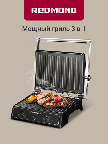 РЕДМОНД SteakMaster RGM-M821 – это многофункциональная модель «3 в 1». RGM-M821 сочетает в себе возможности мощного гриля, мини-духовки и жаровни для барбекю, и позволяет готовить множество различных блюд: от еды на каждый день до оригинальных праздничных угощений. Готовит как гриль, духовка и барбекю • Жарьте стейки, куриные крылышки, котлеты для бургеров и другие блюда-гриль, поместив продукты между панелями. • Разложите гриль на 180° и готовьте закуски-барбекю, выкладывая ломтики говядины, свинины, овощей, грибов или фруктов сразу на две панели. • Запекайте блюда как в духовке – при помощи гриля можно сделать пышный бисквит, омлет, мясо по-французски, овощное рагу и многое другое. Для этого просто поместите продукты форму из фольги или противень RAM-BP1*, и поставьте форму между панелей гриля. Настройка температуры с шагом 5°С Благодаря опции регулировки температуры вы легко установите правильный нагрев для жарки, запекания и тушения любых продуктов. Температуру можно задать от 120 до 230°С с шагом 5°С. Таймер до 60 минут Используя таймер, выберите время от 1 до 60 минут с точностью до 1 минуты, запустите приготовление и будьте уверены, что еда не подгорит и не пересушится! Как только заданное время подойдет к концу, RGM-M821 автоматически остановит нагрев панелей. Съемные панели с антипригарным покрытием Антипригарное покрытие предотвратит прилипание пищи, даже если для жарки вы практически не добавляете масло. Панели прибора отсоединяются, а очистить их можно обычными неабразивными средствами для посуды. Также панели можно мыть в посудомоечной машине. Регулировка прижатия панелей Регулятор высоты крышки поможет добиться оптимальной степени прижатия панелей при жарке продуктов разной толщины. Скорректируйте расстояние между панелями, когда готовите целую дораду или, например, поджариваете плоские лепешки, чтобы блюдо готовилось равномерно с обеих сторон. Книга рецептов Вместе с RGM-M821 вы получите кулинарную книгу с рецептами для вашего гриля. Рецепты разделены на тематические блоки, а пошаговое описание сделает процесс приготовления максимально легким. SteakMaster РЕДМОНД – жарит по-настоящему! * Противень РЕДМОНД RAM-BP1 и фольгированная форма не входят в базовую комплектацию прибора и приобретаются отдельно