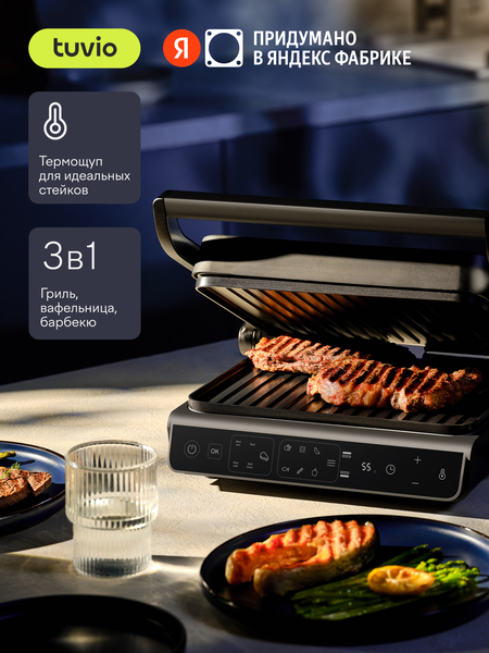 Tuvio — это бренд удобной бытовой техники, придуманный в Яндексе. Tuvio TG03DGP — это гриль, барбекю, печь и вафельница в одном устройстве. Мощность устройства 2200 Вт, а максимальная температура нагрева — 230 °C, которую можно настроить вручную. Гриль быстро и равномерно разогревается и справляется даже с толстыми кусками мяса или рыбы. В устройстве 10 автоматических режимов, в том числе для обжарки до румяной корочки или быстрой разморозки продуктов. Для идеальных стейков есть термощуп: он сам определяет степень прожарки и отключает гриль, когда мясо готово. Таймер и индикатор помогают отслеживать процесс приготовления других блюд — например, овощей или рыбы. В комплекте — панели с антипригарным покрытием для гриля и венских вафель. Они подходят для приготовления блюд без масла и жира: излишки стекают по специальному желобу в поддон. На гриле можно поджарить мясо с аккуратными аппетитными полосками, как на настоящем огне. За устройством просто ухаживать: съёмный поддон и панели легко отсоединить и помыть в посудомоечной машине.